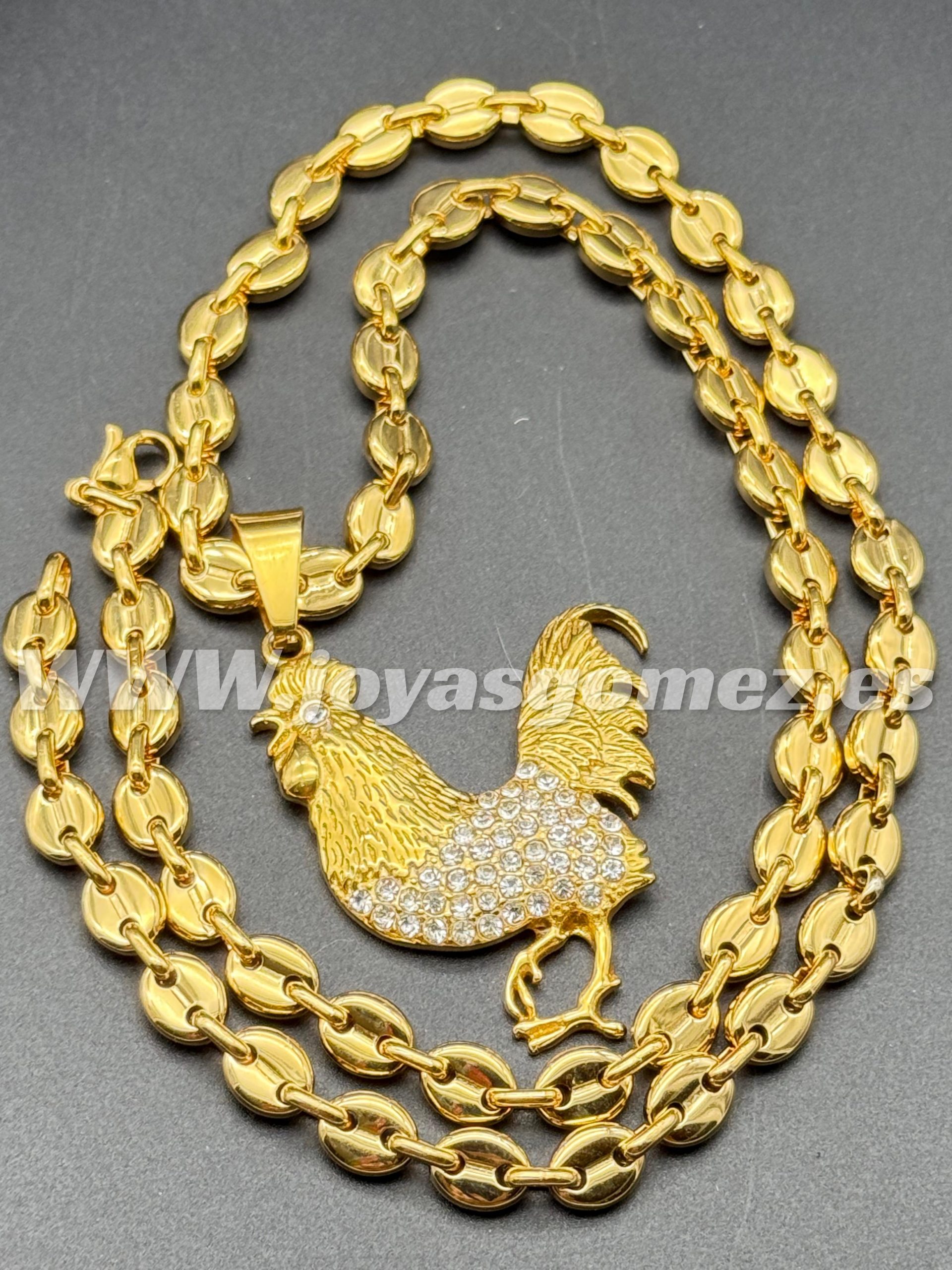 Cadena café 6*60 cm+Colgante gallo circonitas ,acero 316L chapado oro 18k