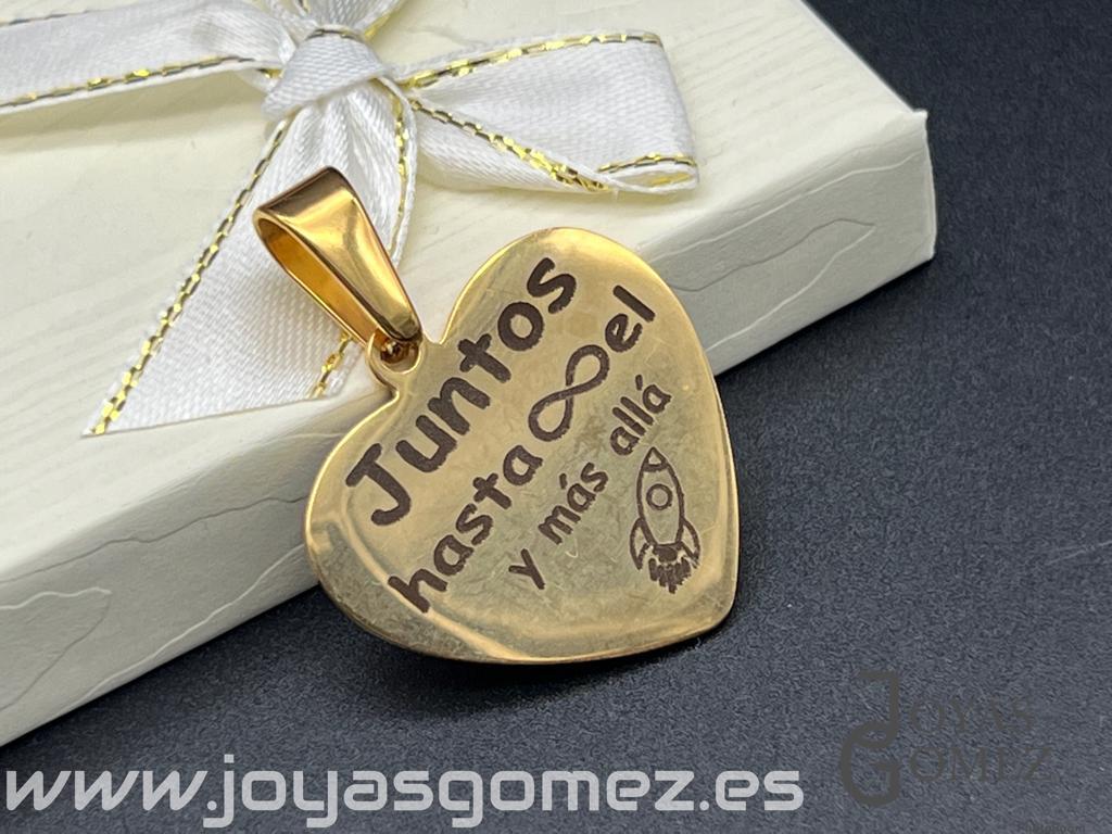 Colgante Corazón 3*3 cm, grabado láser, acero 316L chapado oro 18k (texto incluido)