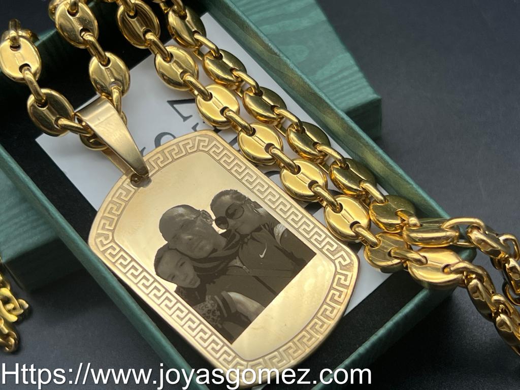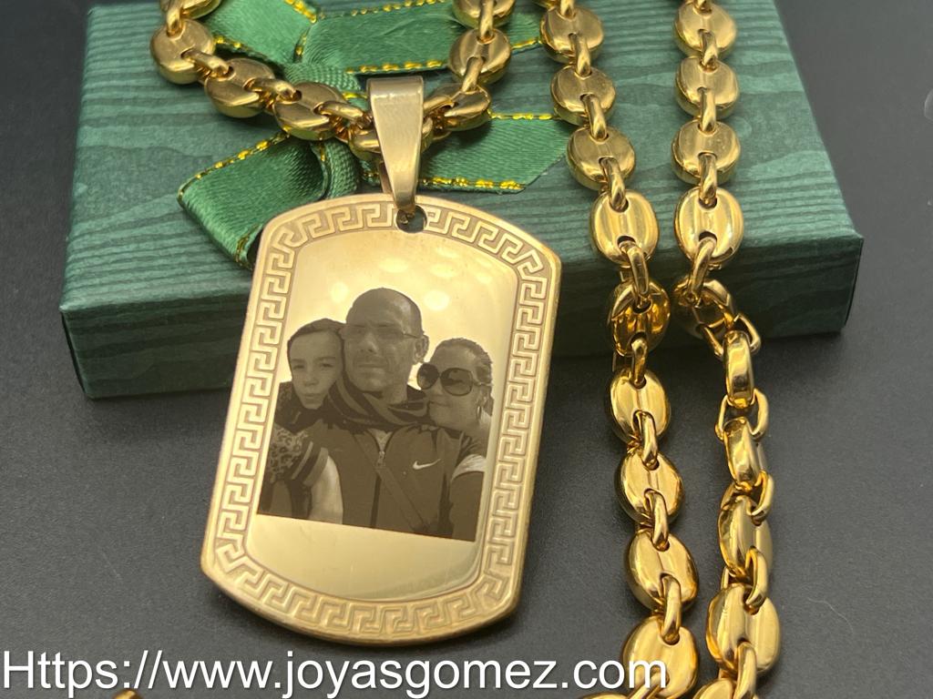 Colgante Placa greca grande+cadena cafe, foto grabación láser, acero 316L chapado oro 18k