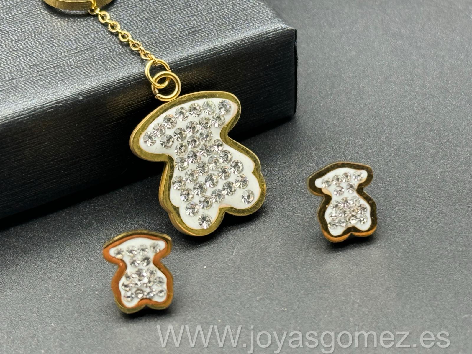 Conjunto ositos circonitas blancas, acero 316L chapado oro 18k